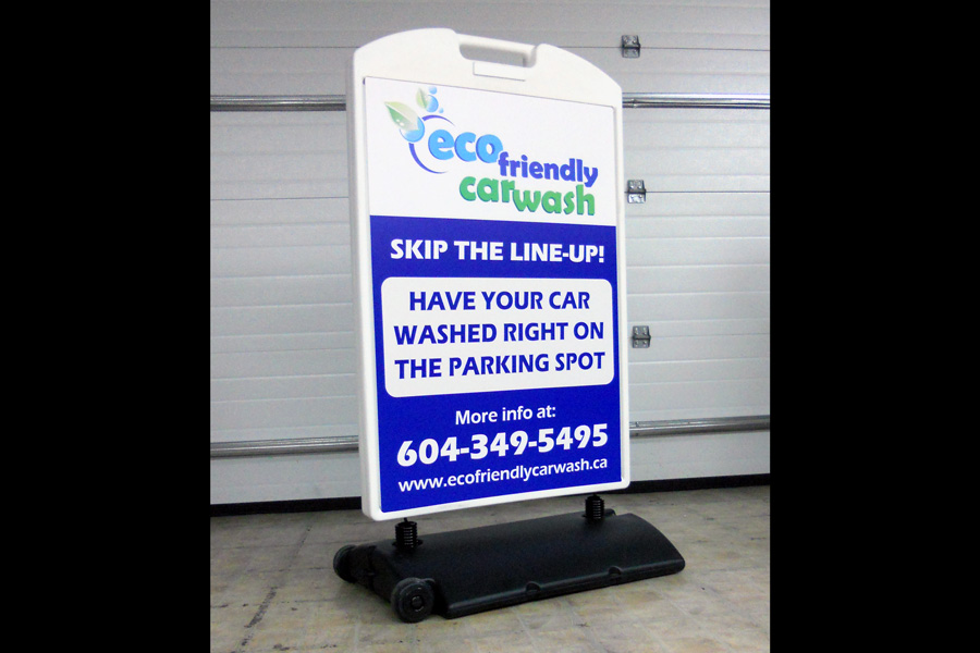 24"x 36" Plastic sandwich board with sand filled base and coroplast inserts.