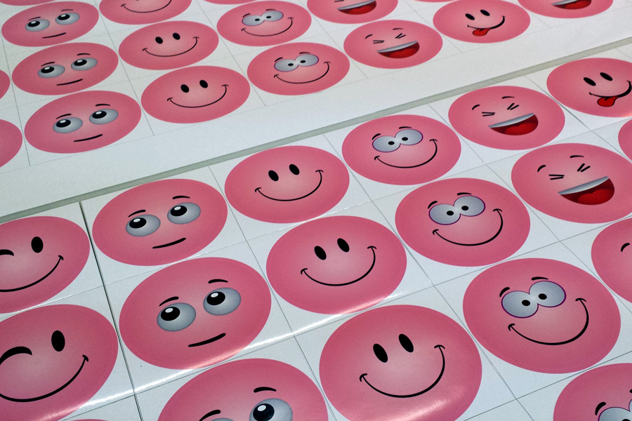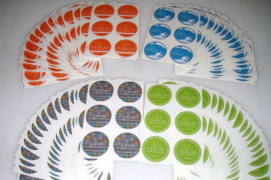 3.5" diameter decals, digital printed vinyl, gloss lamination, contour cut.