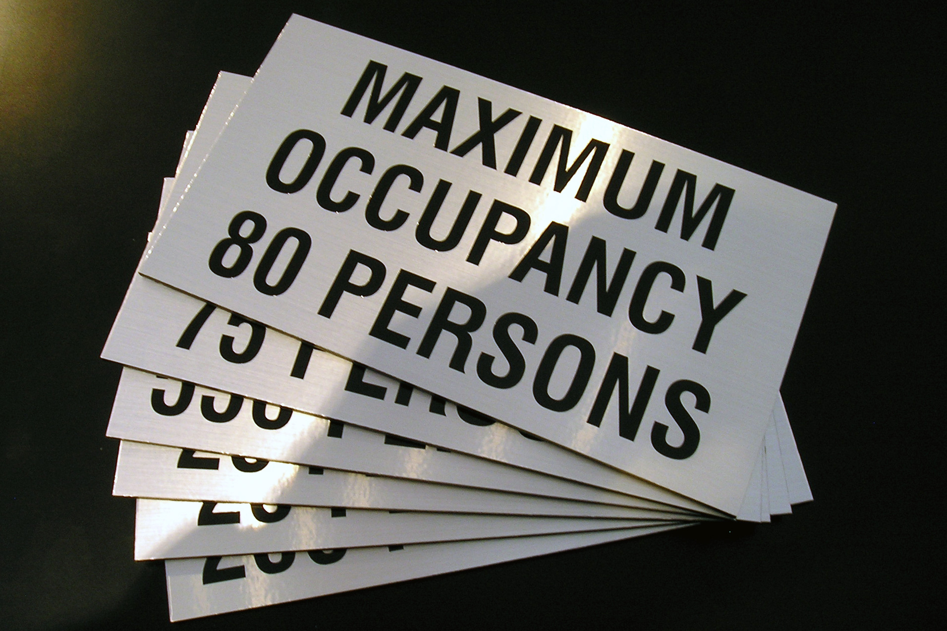 5" x 9" 3mm black PVC, with brushed aluminum vinyl, and black lettering.