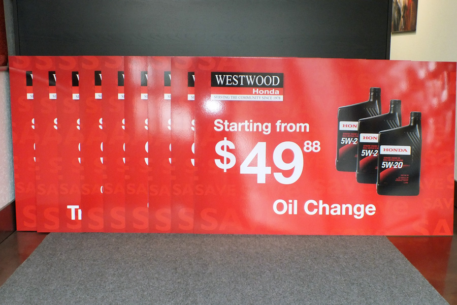 4mm coroplast, custom shape, with digital printed vinyl, gloss laminated.