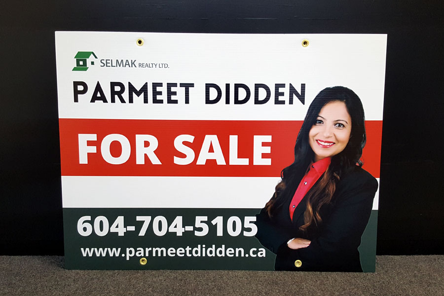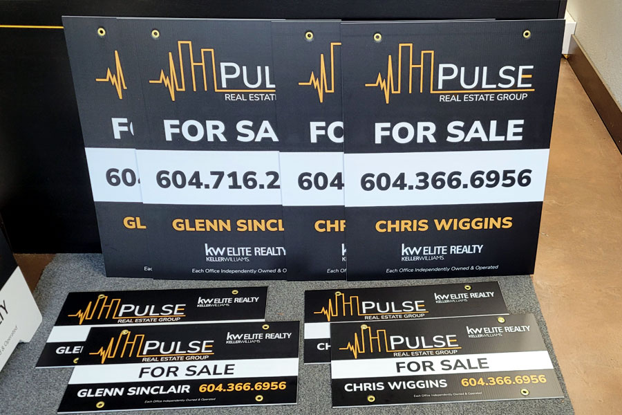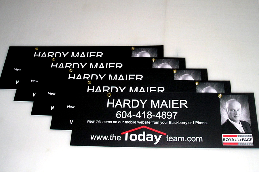 6"x 24" 4mm coroplast double sided, digial printed, laminated, 2 grommets.