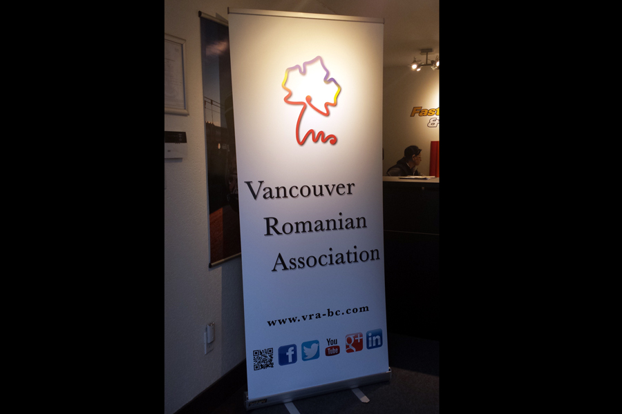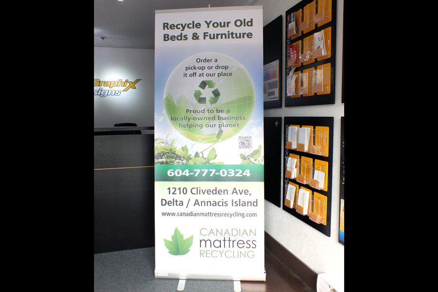 Table top 12" x 16" retractable banner with graphics printed on polyproplylene film.