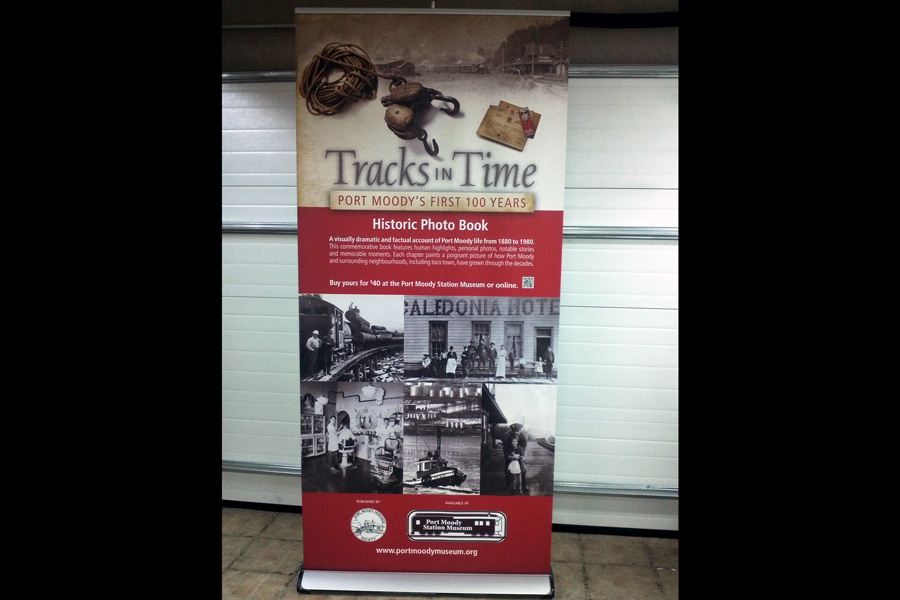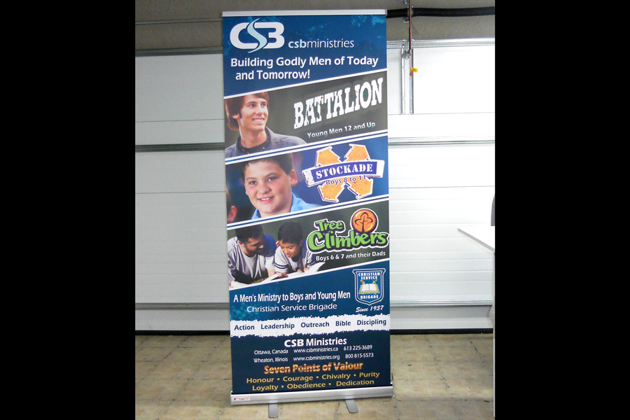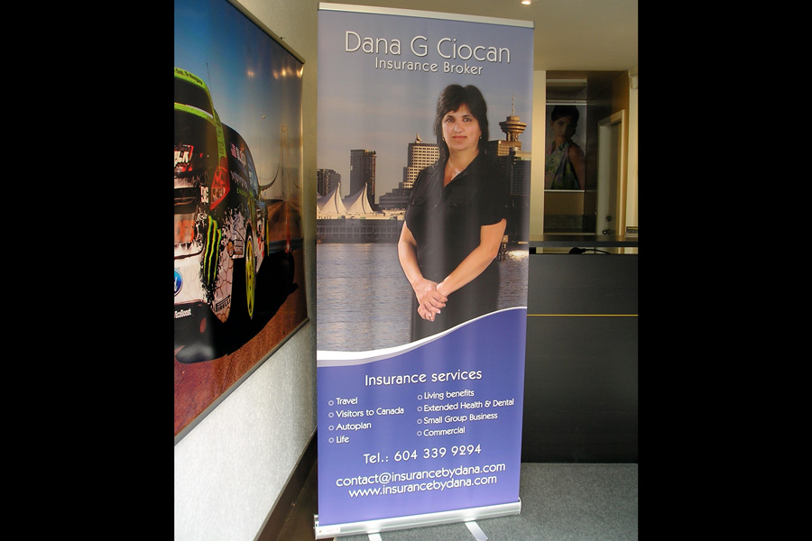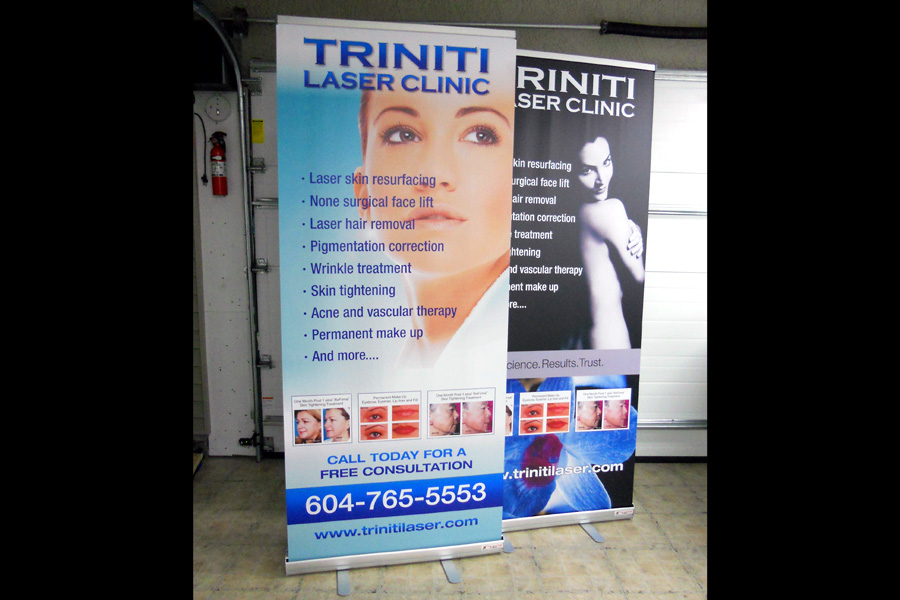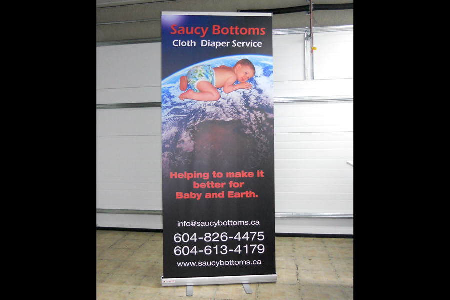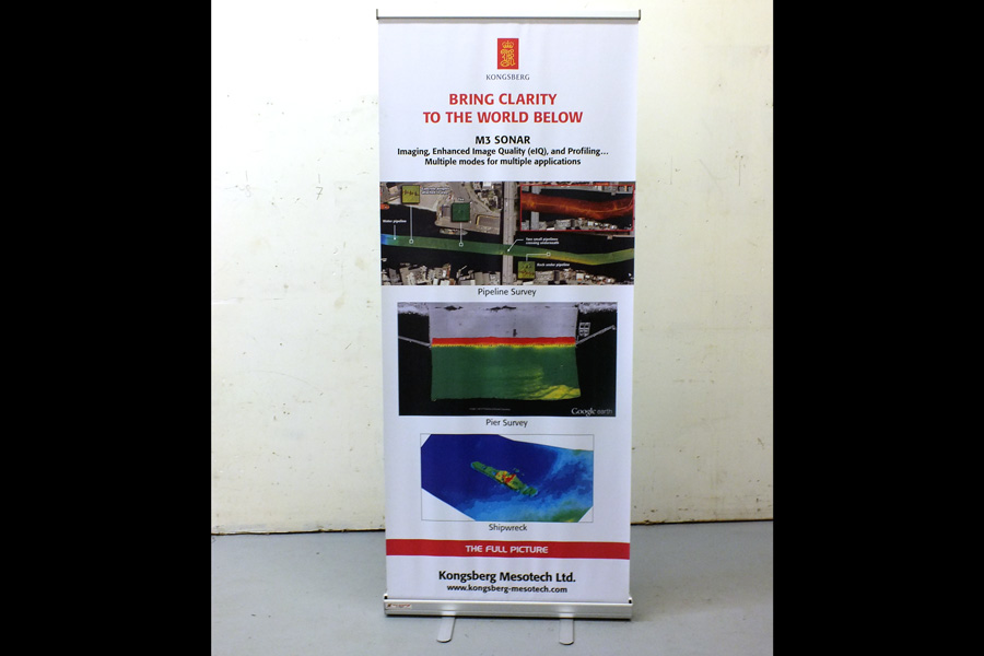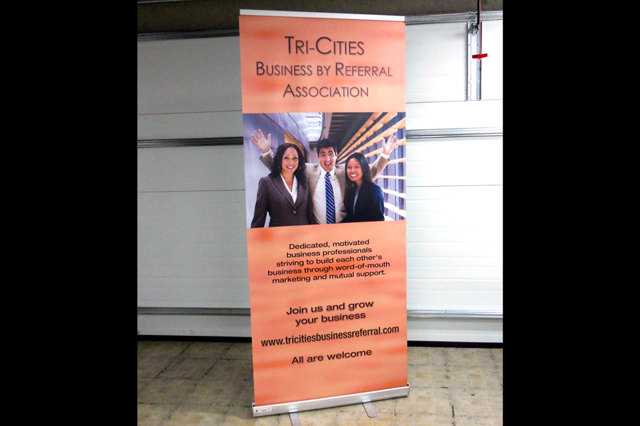 Economy retractable banner stand, with 48" x 79" graphics printed on display cloth material.