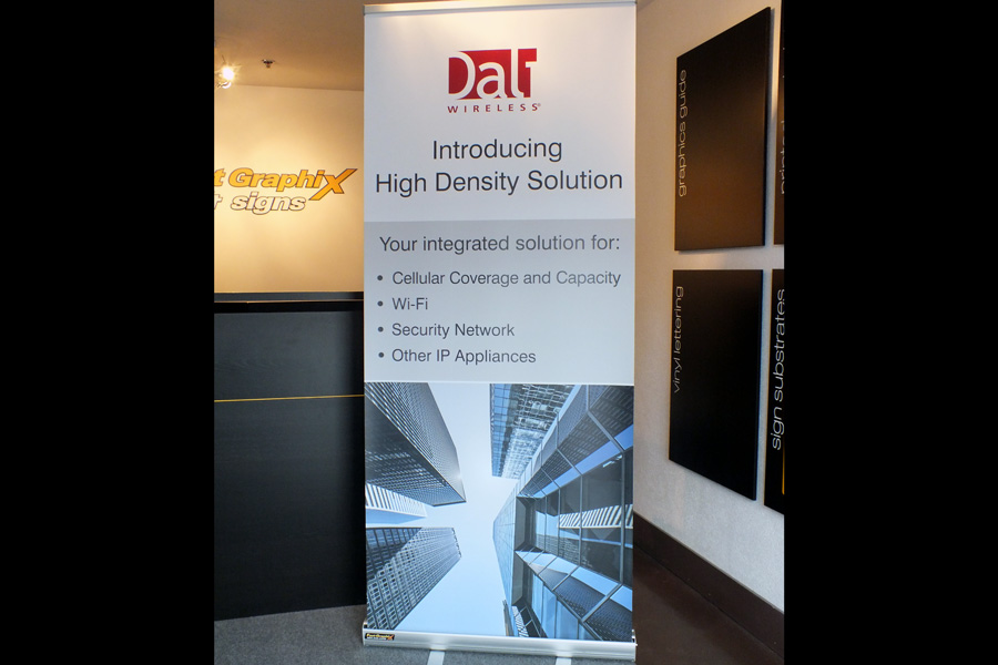 Premium retractable banner stand, with 33.5" x 79" graphics printed on display cloth material.