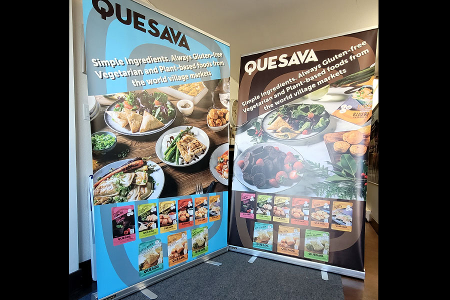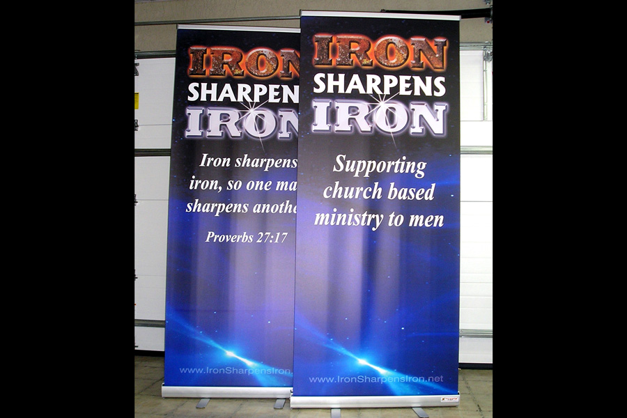 Metal X banner stand with 24" x 64" graphics printed on display cloth material.