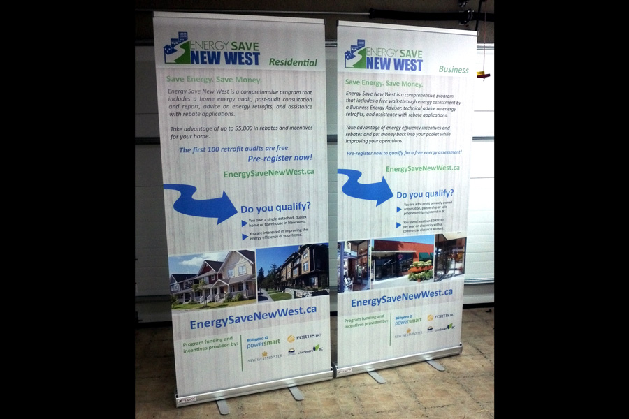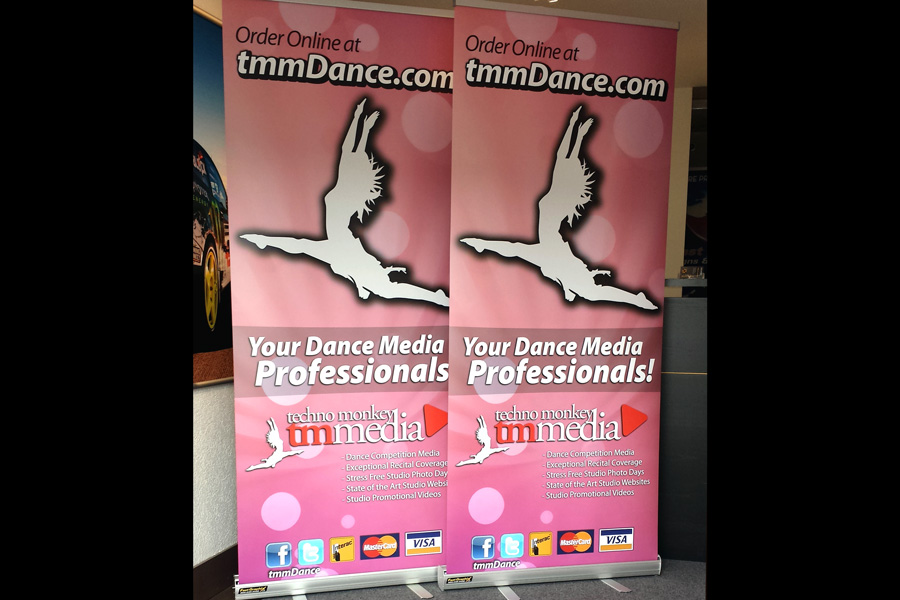 Economy retractable banner stand, with 33.5" x 79" graphics printed on trade show display polypropylene film.
