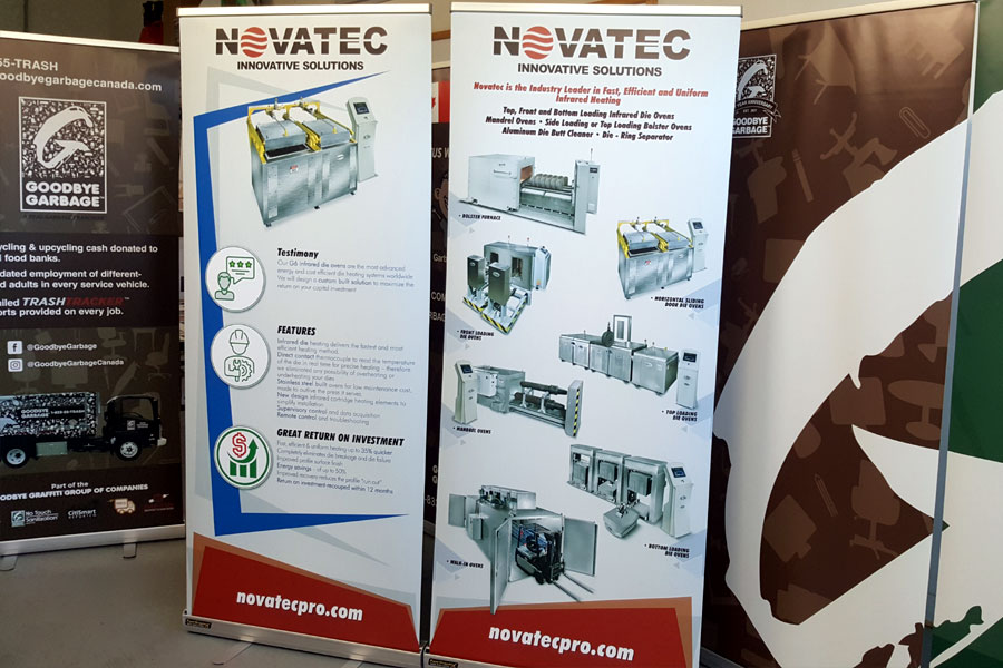 Detail - Premium black retractable banner stand, with graphics printed on polypropylene film.