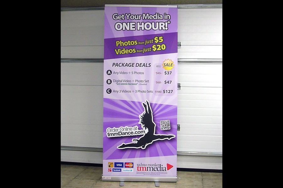 Economy retractable banner stand, with 33.5" x 79" graphics printed on display cloth material.